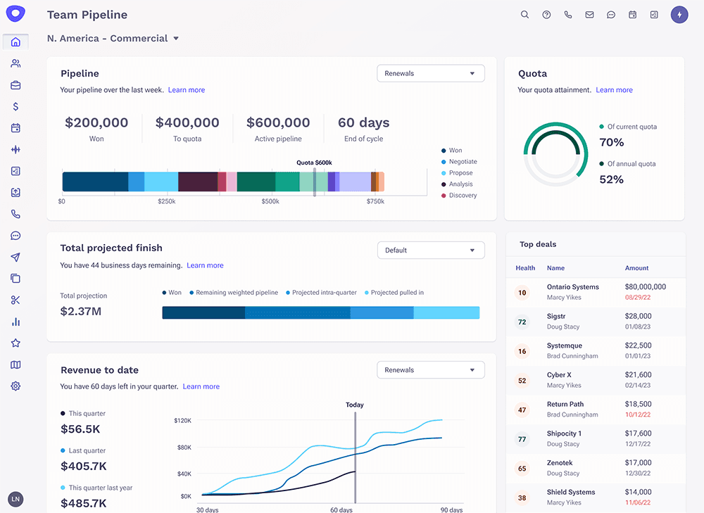 Pipeline Dashboard brings all of the relevant pipeline details to life in a single, sortable view, allowing sales managers to stay on top of their quarter.