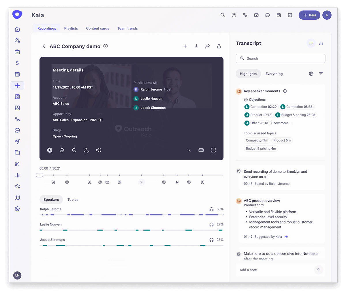 Were turning predictions into conviction. Account executives and sales managers can see how the opportunities in their pipeline are trending and whats at risk at a glance in Deal Overview with a keen eye on Deal Health, win more deals with Success Plans while enforcing proven sales methodologies and arm your reps to learn from great examples and excel in their meetings with Kaia.