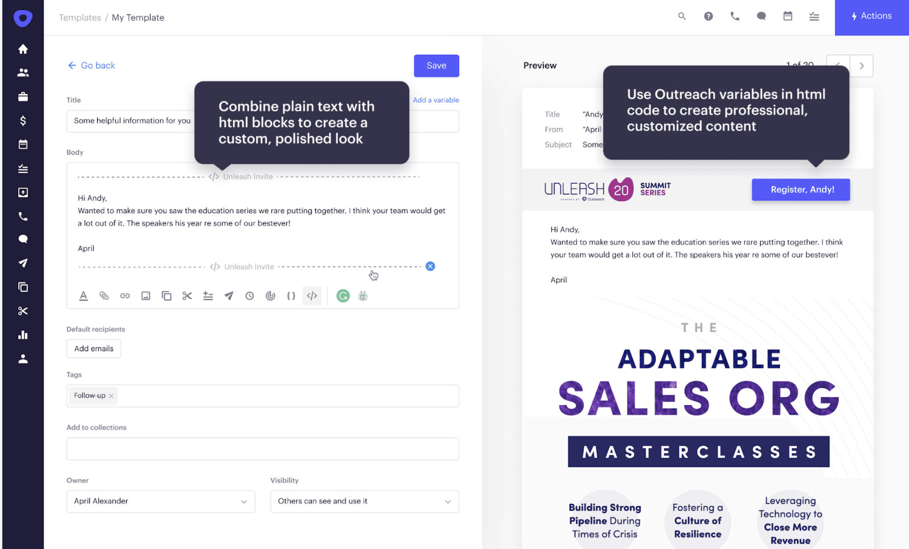 For years, “sales and marketing alignment” has been one of the most pressing topics in whitepapers, events, webinars, and any other discussion forum. Common friction areas including marketing asking sellers to inform their customers of events, new product releases, upcoming webinars, and more. Outreach helps marketers to close this gap by allowing them to create customized email content for sellers to use in Outreach.