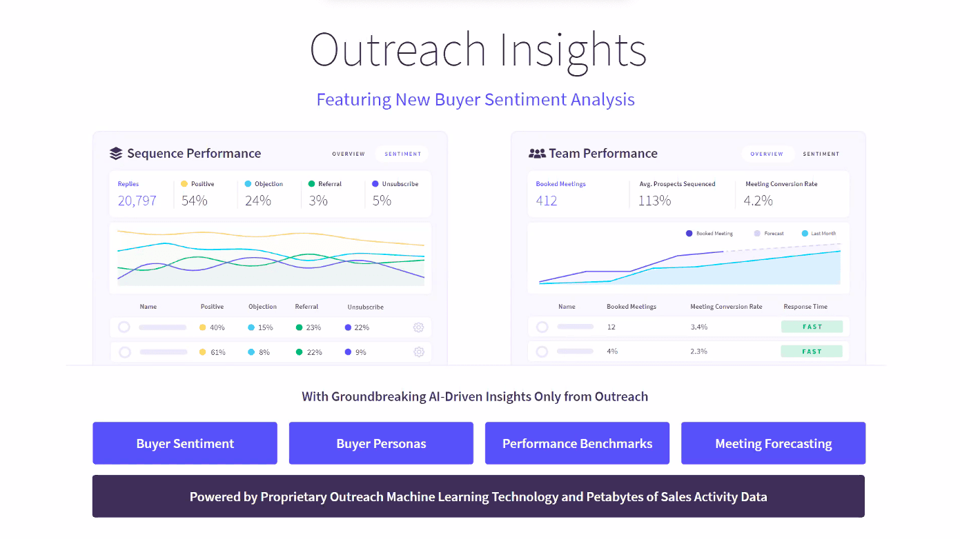 To solve this challenge, Outreach is excited to introduce Outreach Insights featuring Buyer Sentiment Analysis, a first-of-its-kind machine learning technology that classifies buyer emotions and signals to accurately measure sales engagement. We’re rolling out two new reports featuring buyer sentiment, of many to come, to enable customers with actionable insights into their sequence and team performance.