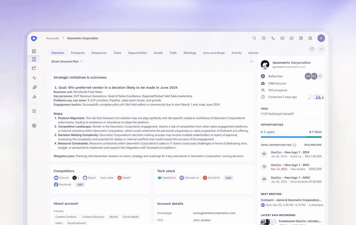 Outreach's Account Management software uniquely centralizes all account intelligence within the platform, automatically updating and seamlessly integrating into daily workflows. With quick access to comprehensive account intelligence, account teams can easily collaborate strategically on building and executing account strategies, whether they are aiming to win or grow key accounts.