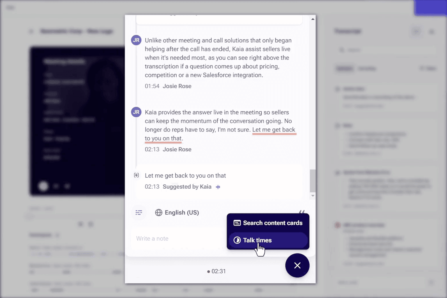 Outreach Kaia™ delivers real time coaching with Content Cards, which surface answers to tough buyer questions around competitors, pricing, integrations and products. This allows reps to build buyer trust and for new reps to ramp up quicker without commitment content to memory or relying on managers to guide them on calls.