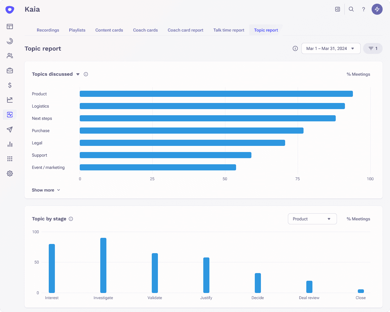 Understand what topics are coming up with buyers across sales stages and identify where reps have been successful to replicate across the team.