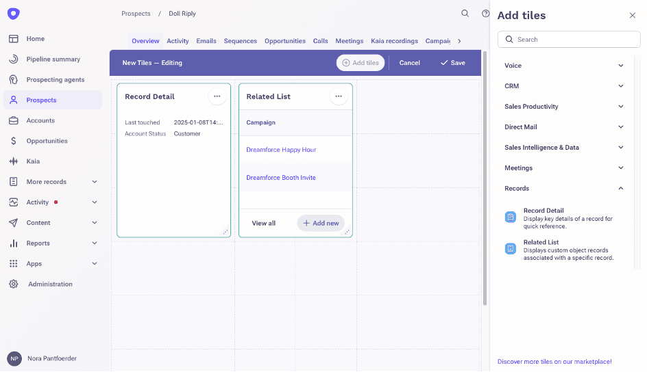 • Further role-based customizations include tiles that surface insights, actions, and opportunity details, all in one place