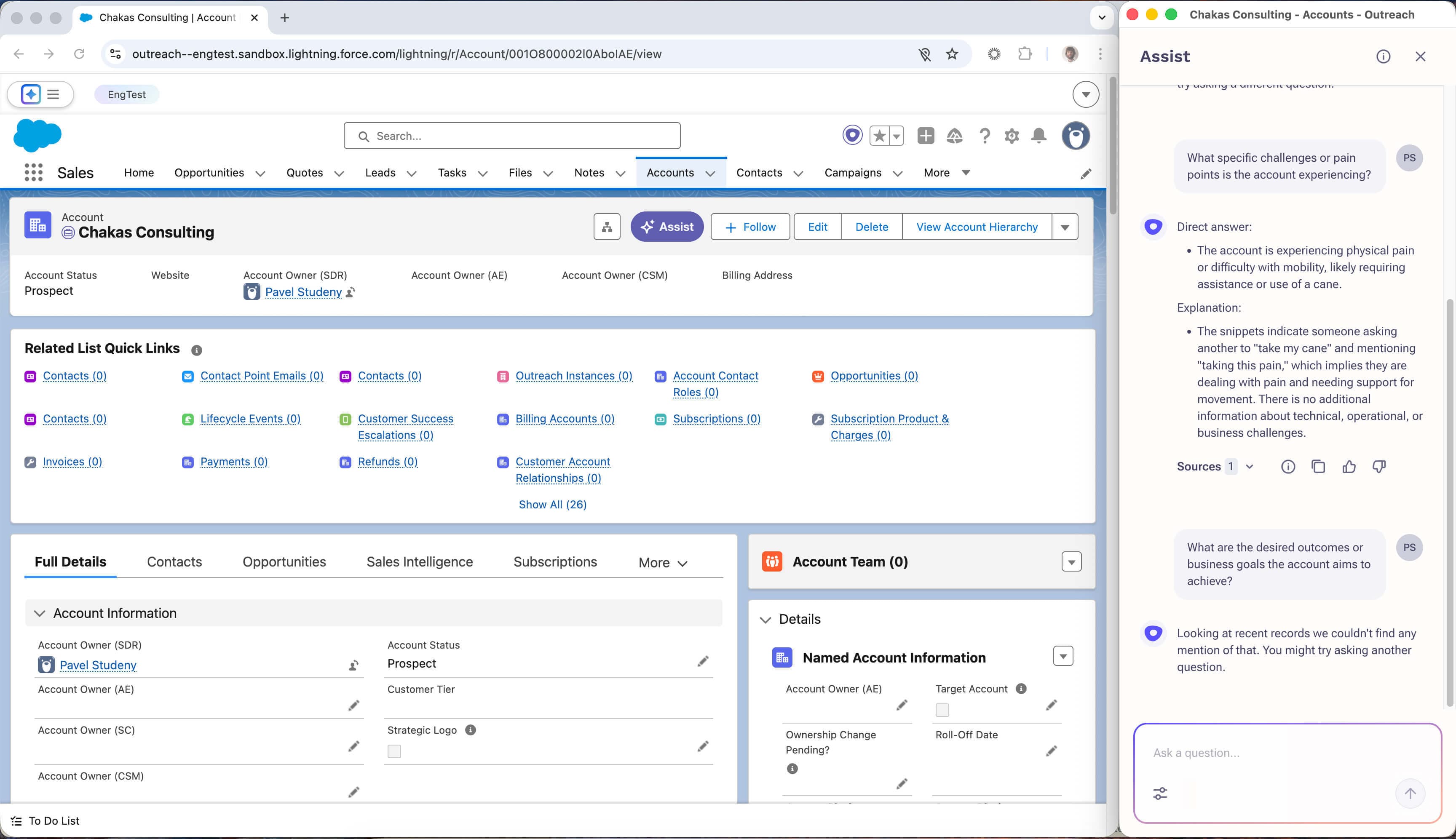 - Access Account Assist directly in your CRM, Outreach extensions, and the prospect side panel, so insights show up wherever your team works