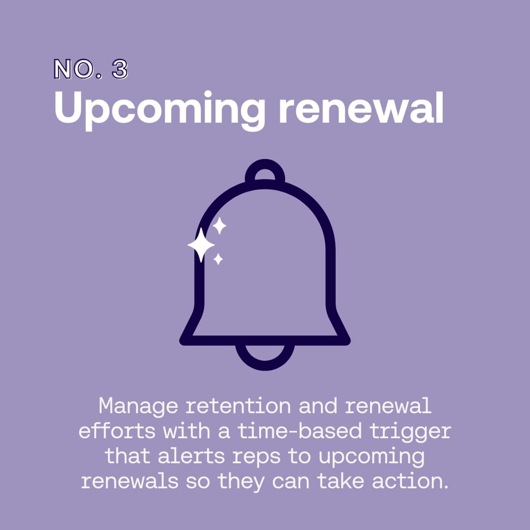 When a customer's renewal date is approaching, time-based triggers can be set up to alert the sales team and allow them to engage proactively. It's essential for managing retention and renewal efforts, giving reps ample time to handle contract discussions or address any client concerns before the renewal deadline comes around.