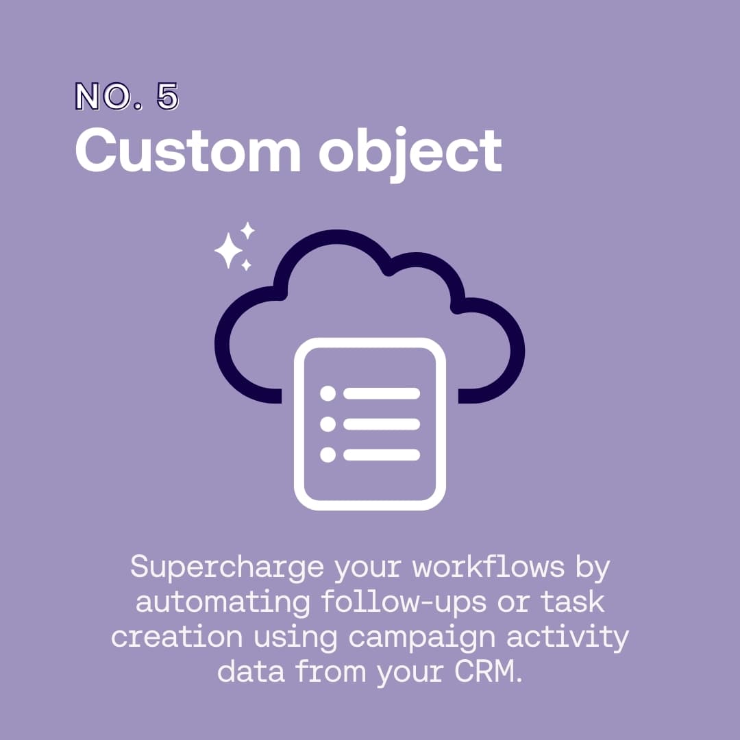 Custom Objects allow customers to bring data specific to their unique business needs into the Outreach platform from CRM, beyond standard objects like leads or contacts. You can use custom objects tied to specific campaigns to automate follow-ups or task creation based on campaign interactions. It's useful for targeting prospects based on their campaign activity, ensuring relevant and timely engagement that aligns with their demonstrated interests.