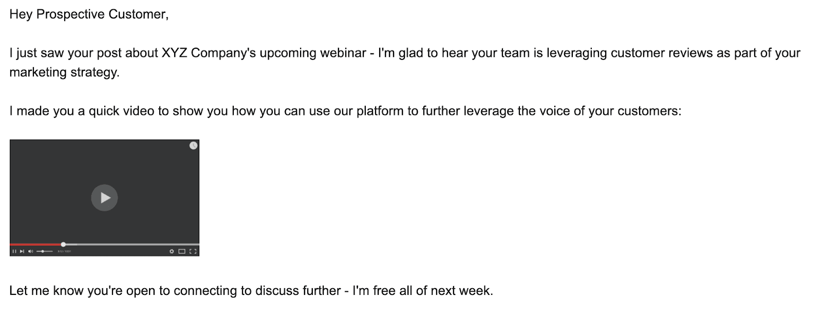 As you can see from the example above, the email lead-in copy is short and sweet, and it shows that you did research beforehand. The text after the video is also concise. You won’t have the reader’s attention for very long, and you want their focus to be on what you’re saying during the video — not the text before and after.