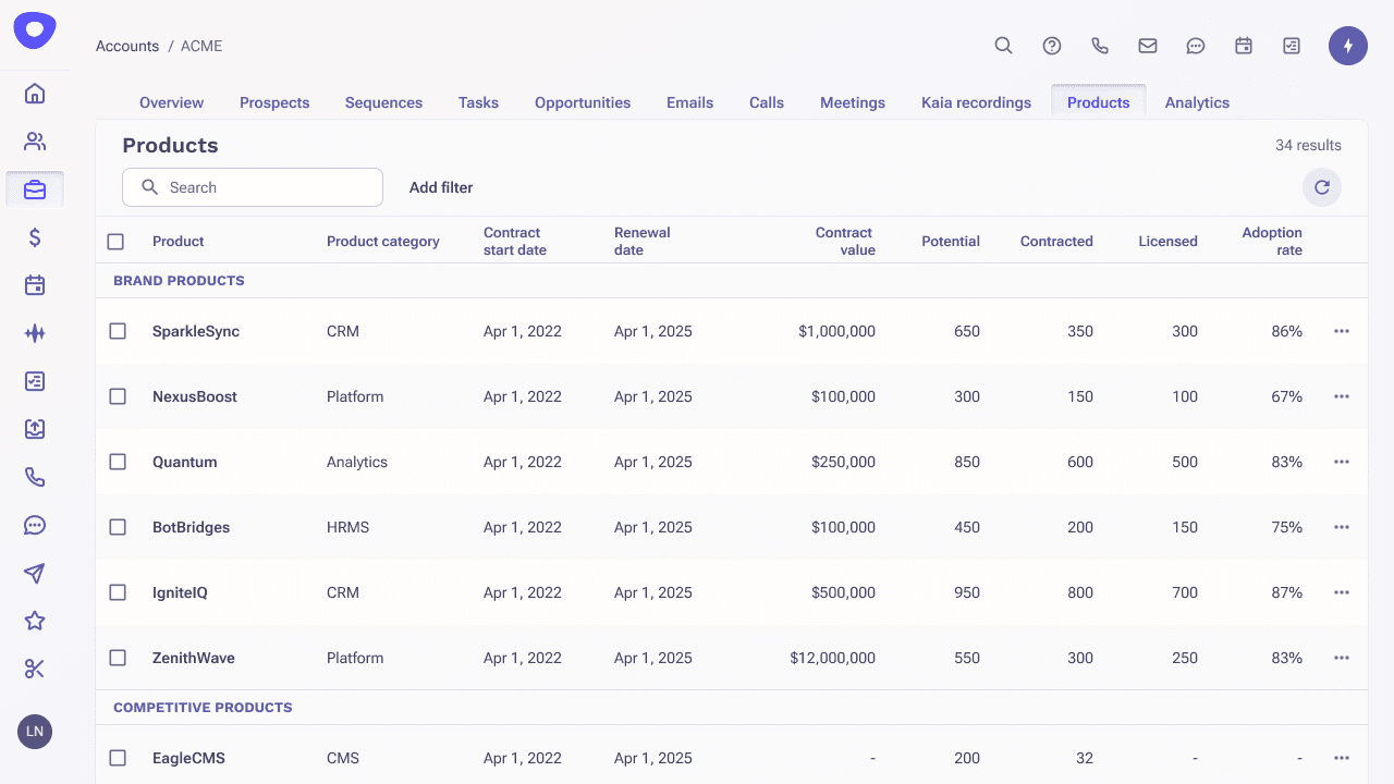 Account Purchases also lets you track not just your own products, but also those of competitors and complementary products. This means you can plan ahead for competitive takeouts, explore integration opportunities, or even strategize co-selling efforts with partners.