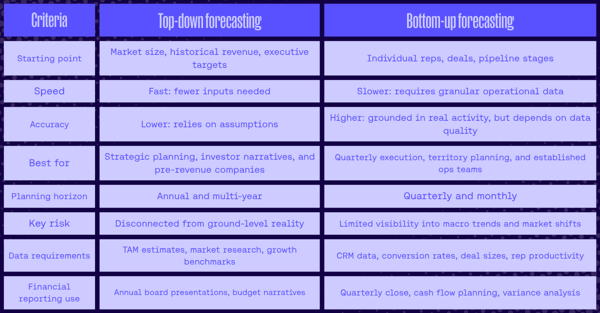 Top-down works best for annual strategic planning and board-level communications. Bottom-up is more effective for quarterly and monthly operational forecasts where you need to connect targets to specific pipeline activity.