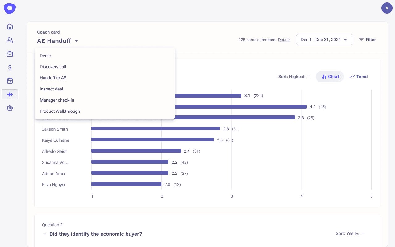 Every coach needs a game plan. Before managers start coaching, understanding what is trending in conversations between buyers and sellers equips managers with the perspective and insights they need before meeting with reps. This allows managers to tailor the coaching conversation with more data and insights, and guide the rep back on track on where they struggle, or where new trends require additional rep support: