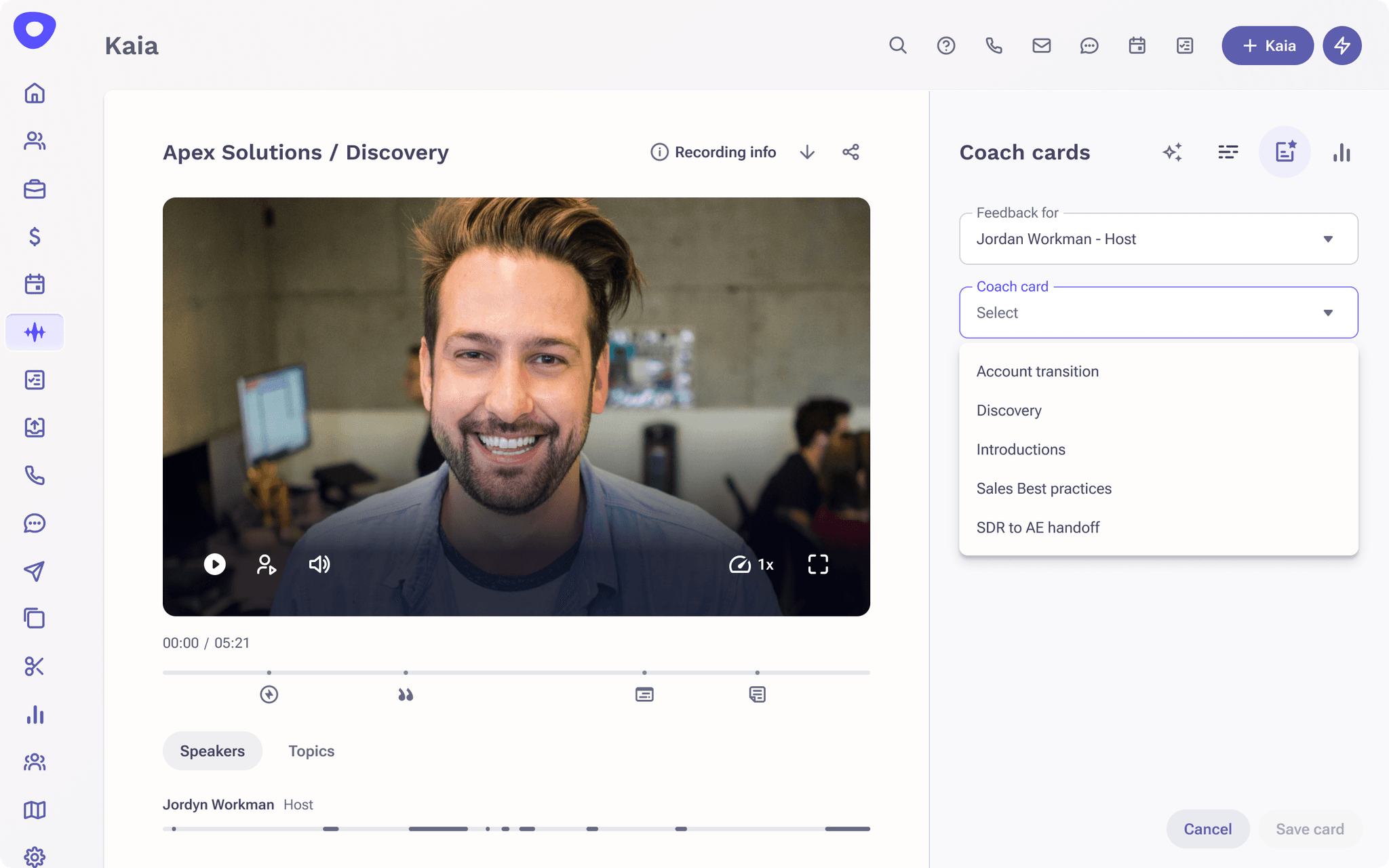 Provide feedback through the Kaia Coach Cards to accompany 1:1 meetings to coach more succinctly and directly, to celebrate success and mentor on ways to improve. Context is imperative and coaching should be multidimensional: a combination of self-improvement efforts, manager support, enablement input, peer encouragement, tip-sharing, and more.