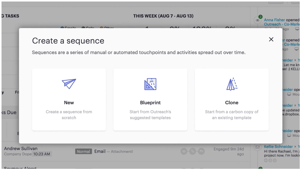 Blueprints are a content library built right into Outreach and provide you with a starting point for any sales email, using email best practices that will get every rep on your team up to speed faster. We’ve taken tried and true content to give you email guidelines that actually work. We’ve sent hundreds of thousands of emails to tens of thousands of prospects, so we have the data to back it up.