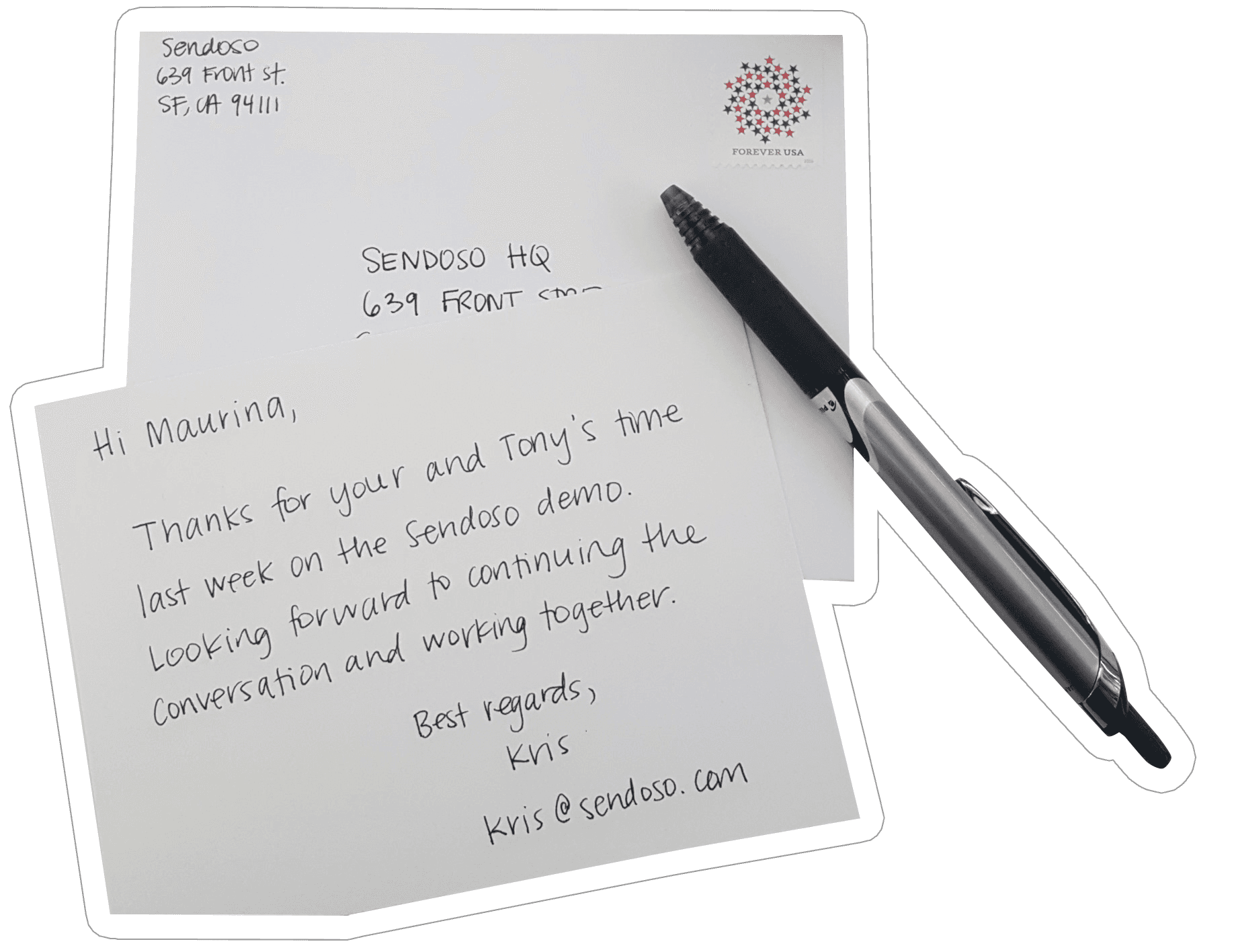 Handwritten notes are a dying art, but that makes them all the more meaningful - and makes it much more likely that you’ll stand out for sending one. Sendoso has a team of writers with A+ penmanship who will compose and pen your note on your behalf. We can even print your scrawl onto a post-it-note for an extra authentic touch.