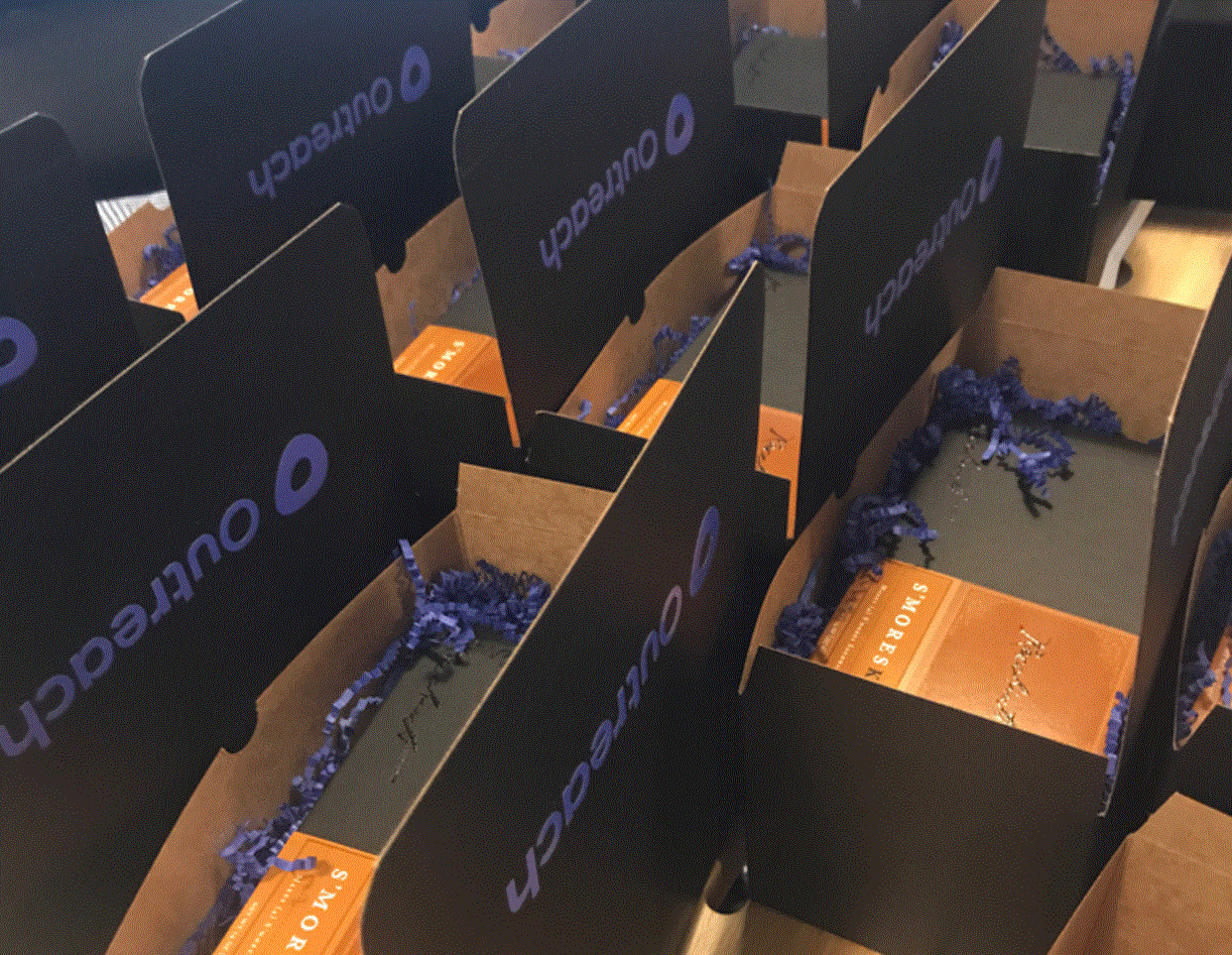 A sweet surprise is even better when it’s delivered in a punchy and clever way. Our team recently sent s’mores kits to large accounts we’re targeting to share how Outreach will help them book “s’more meetings”. Whatever your product does, send your prospects an upscale s’mores kit, with a note that shows how your product can help them realize s’more revenue, meetings, cost savings, etc. No one forgets a well-thought-out pun, especially when it’s that delicious!