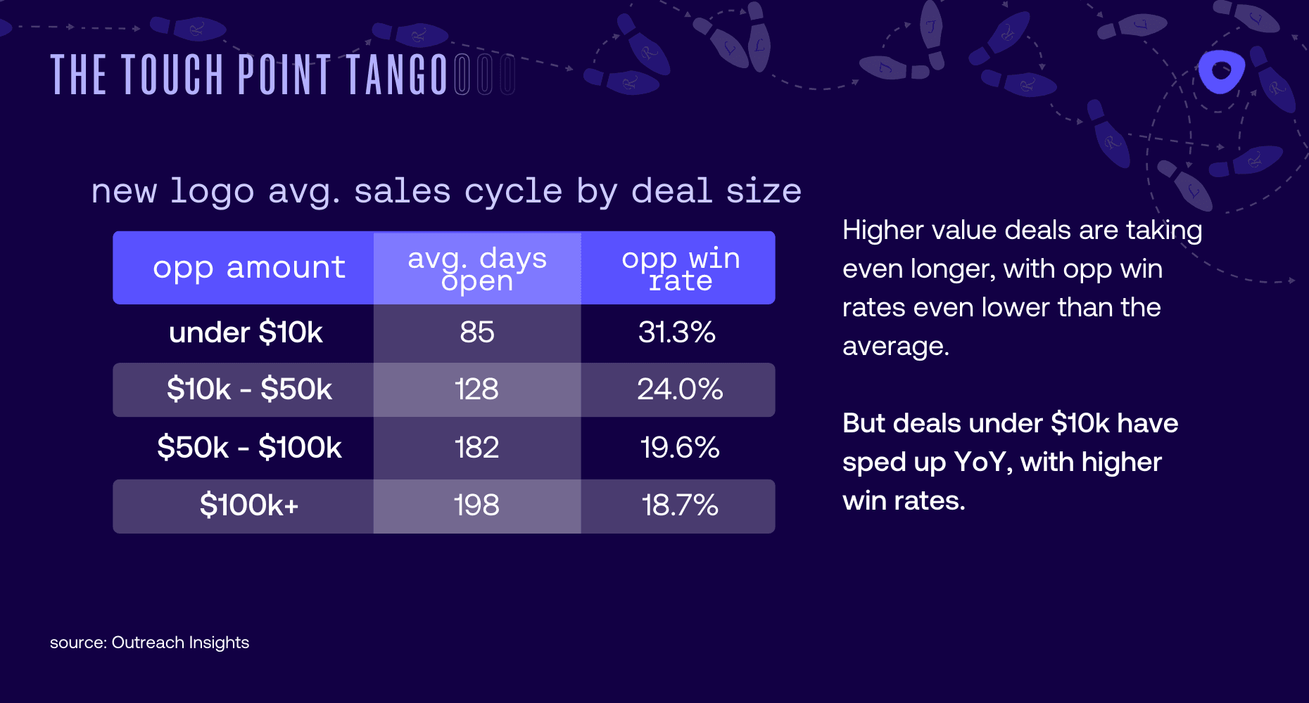 Another interesting factoid we uncovered was that as deal size increases, opp win rates organically decrease, which also echoes previously mentioned historic Outreach data. In the Touchpoint Tango, as deals increased in size, win rates became lower and sales cycles became shorter. When everyone has the budget heebie-jeebies, no one wants to make a mistake (especially a big mi$take).