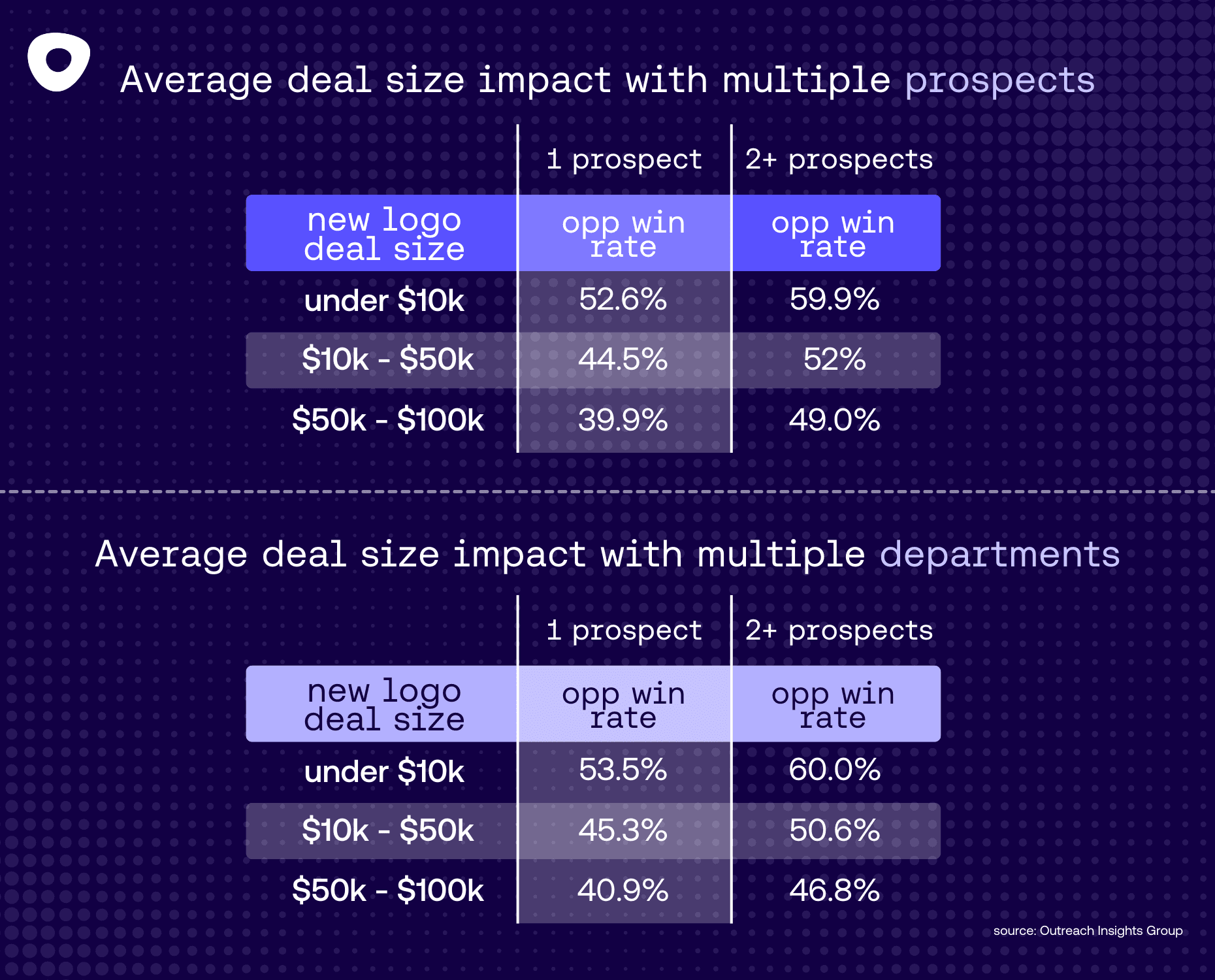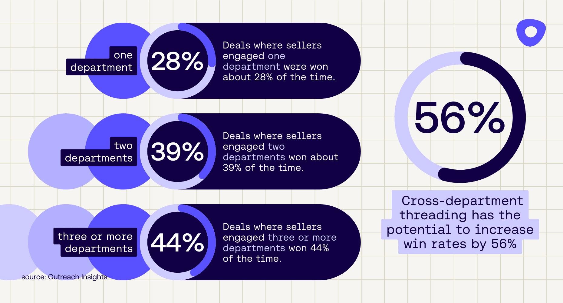 If less is good, more is better – at least when it comes to engaging multiple prospects and departments in your expansion opportunities. Statistically speaking, one prospect is good, but more than one is better. One department is good, more than one is better. And we’ve seen this phenomenon before: historical Outreach data indicates when more than one contact is engaged, deals are 37% more likely to close. But cross-department threading has the potential to increase win rates by 56%.