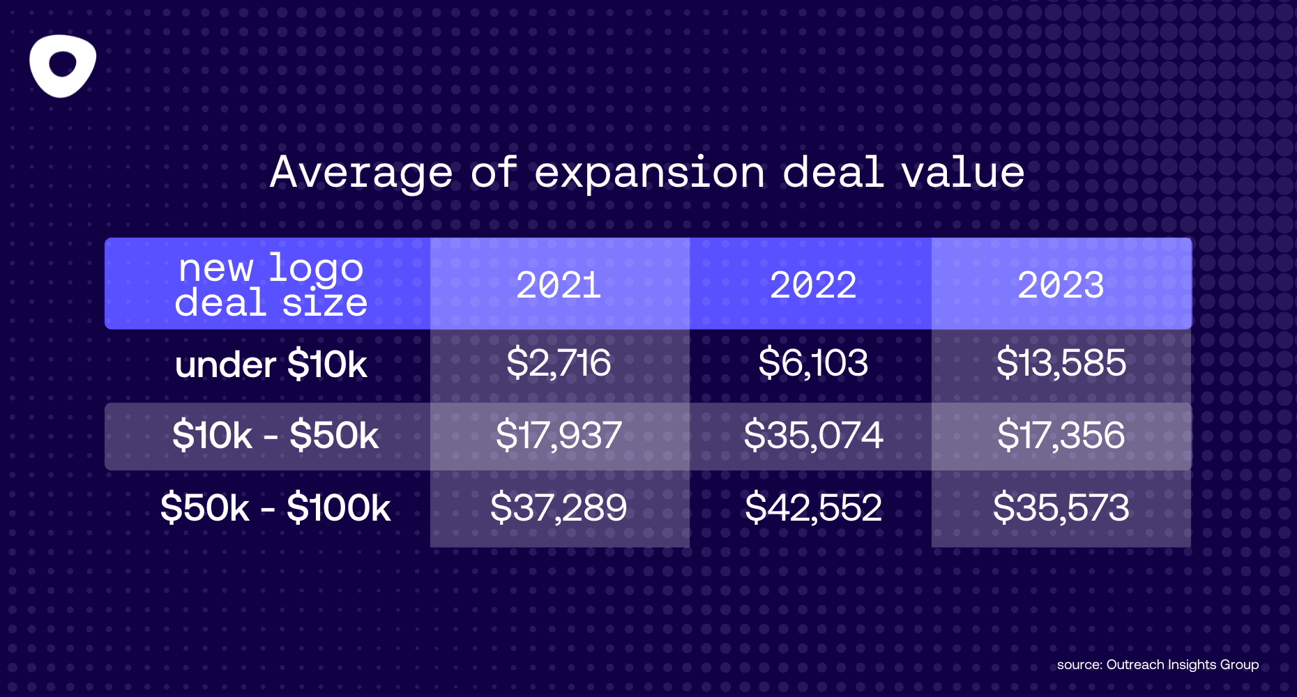 We’re getting whiplash over here. For the most complete and consistent data sets, we focused on 2021-2023 and capped initial New Logo value at $100k. The Outreach platform supports small business and enterprise sellers (and all businesses in between), so this is quite the collection of deals. After an interestingly optimistic 2022, expansion deal value seemed to even out in 2023, with deals under $10k as the only exception – with expansion deals becoming more valuable year over year.