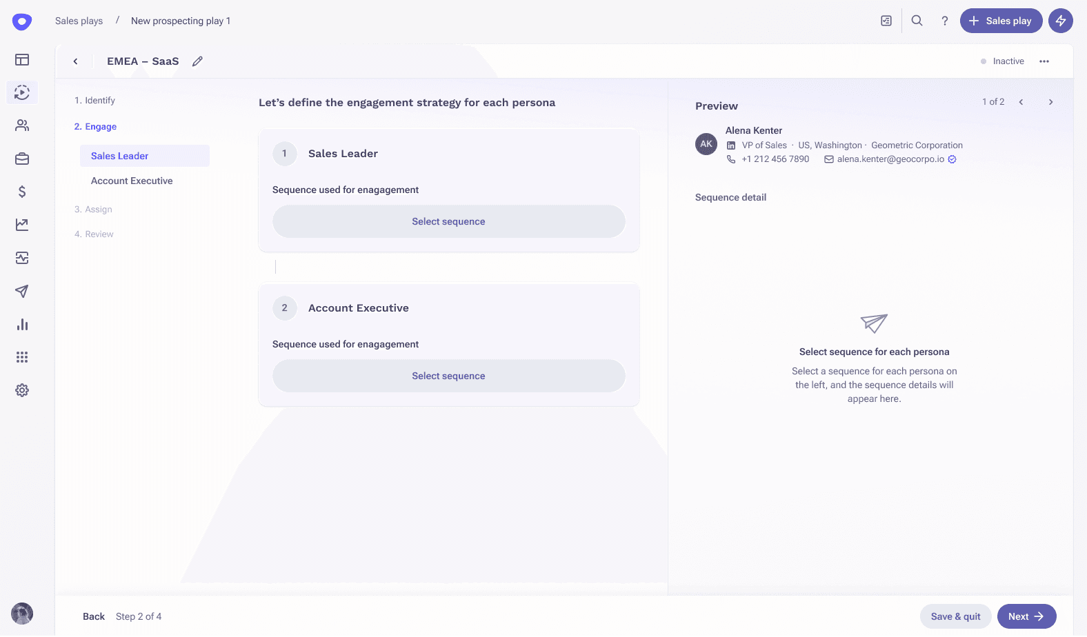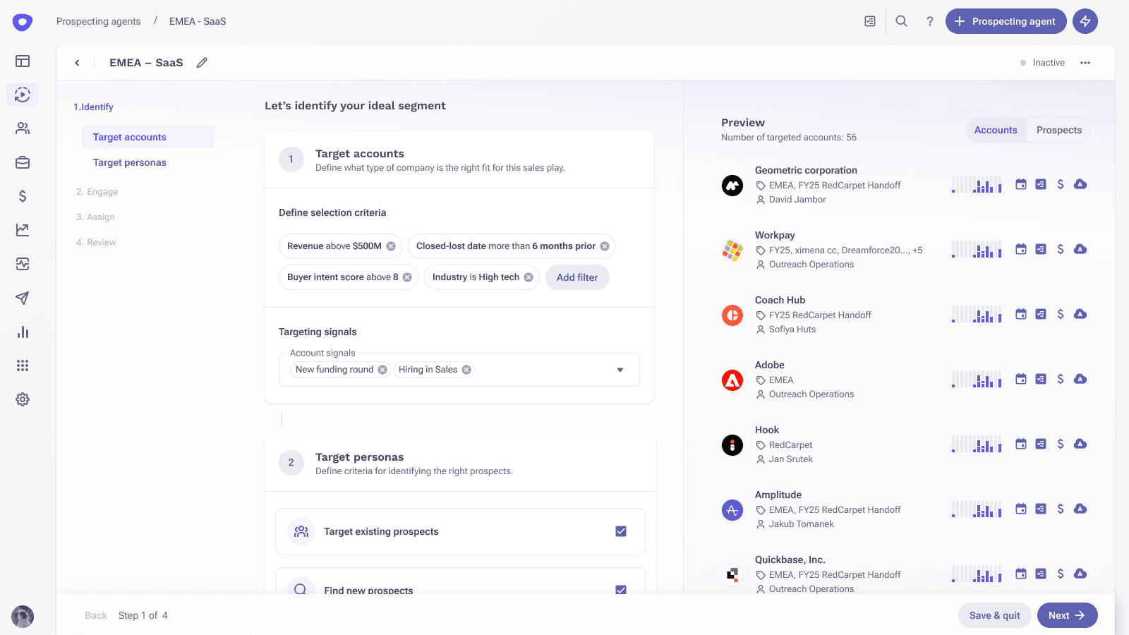 Then, you specify the personas. The agent can identify existing prospects to target, or even identify new prospects that don’t exist in your CRM yet. A great example is an expansion play, where the agent can identify new personas for that next product offering you want to upsell into the account.