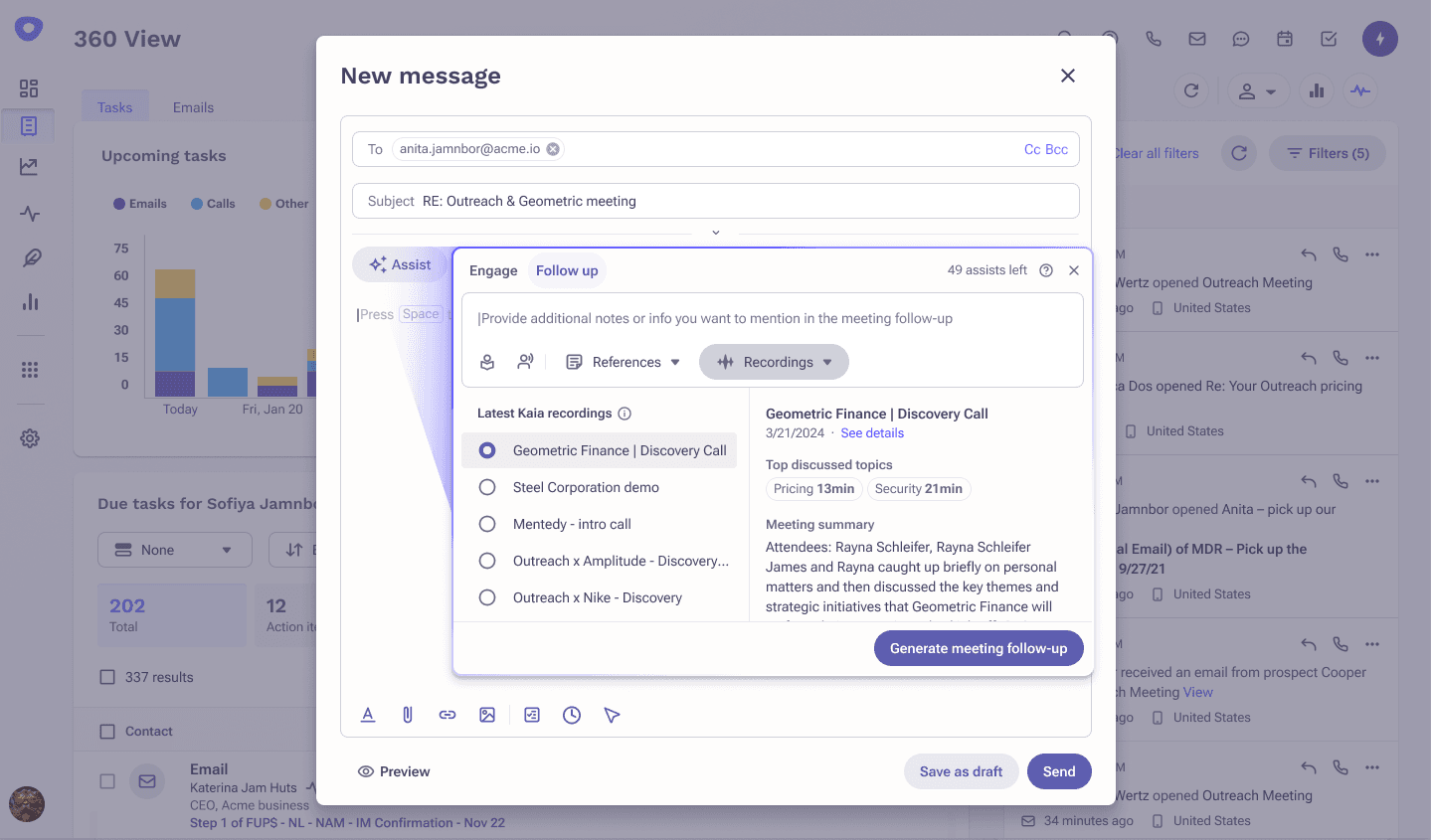 This year, we shipped several Assistive AI features with Generative AI. Outreach summarizes conversations and next steps from every meeting, every call. We help sellers write professional emails in a flash with Smart Email Assist.