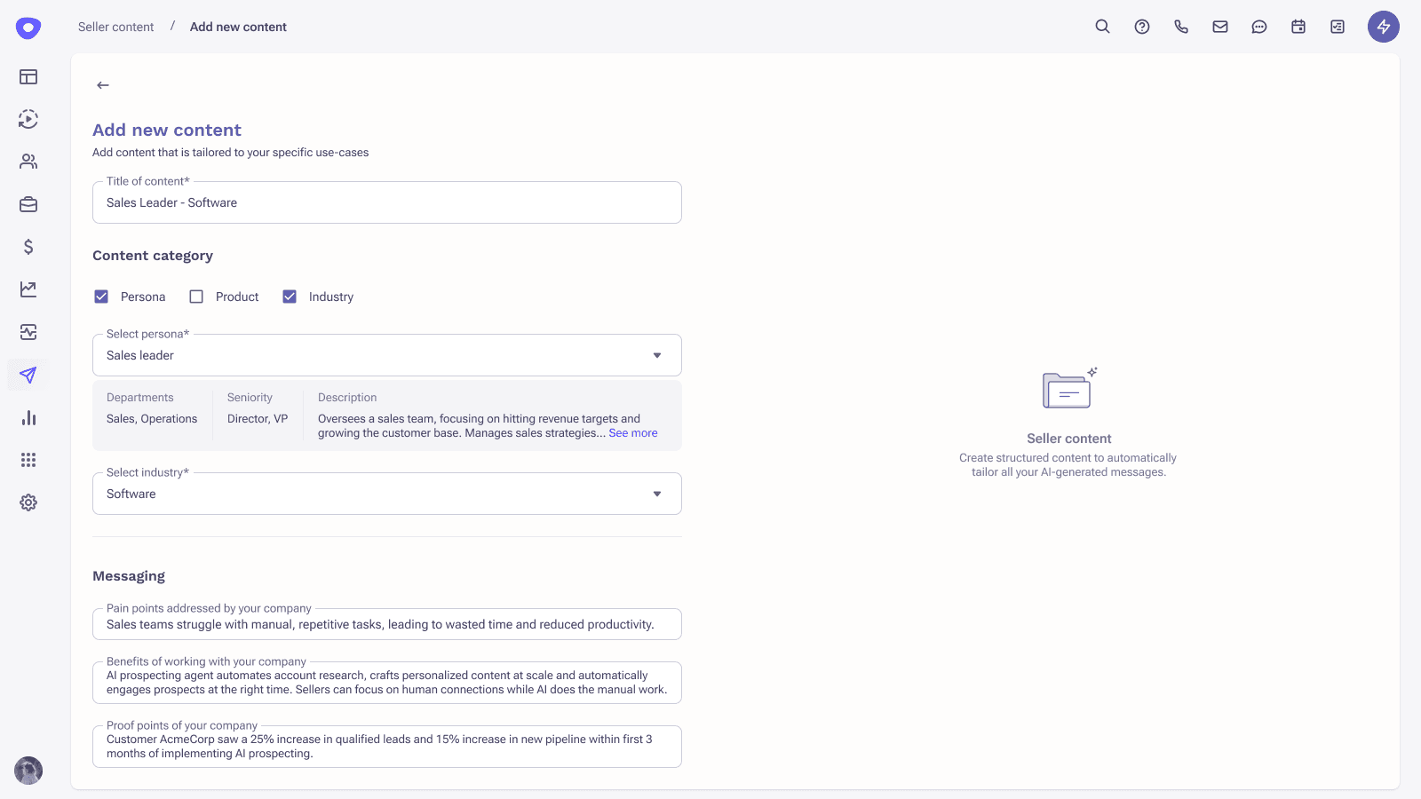 The Seller Content Hub is where you upload your company’s messaging on value prop and pain points addressed by your products & services. This is leveraged in creating customer facing content so it resonates with every buyer, in every industry – in every segment.