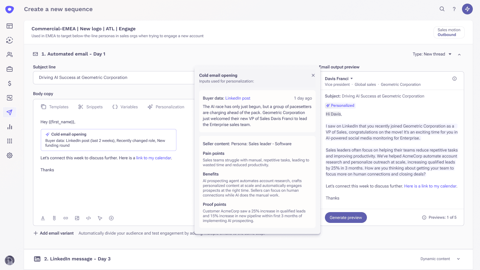 As accounts and prospects are being researched in the background, every content in the sequence can be unique and personalized to that prospect.
