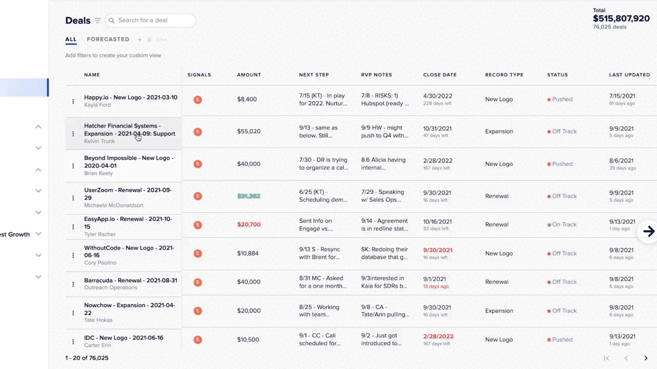 Another anxiety driver for revenue leaders when constructing their forecast is a lack of trust in the deals in their sales pipeline. Many businesses lack objective methods for measuring deal health, which forces leaders to rely on rep and manager opinions or take the time to arduously review every deal in their CRM for possible issues. Even then, possible red flags can get papered over when deal-level reporting is extrapolated into spreadsheets or BI tools. This leads to a high probability of last-minute slippages or losses that send revenue teams scrambling. For example, reps and managers can fall victim to ‘happy ears’, where they hear what they want to hear from a customer and miss or ignore signals that indicate the deal won’t close. With no objective system for measuring health, these deals can end up in the forecast and put the organization’s success at risk.