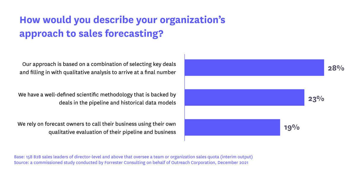 Almost a third of B2B sales leaders say they develop forecasts by referencing key deals and adding in qualitative analysis, according to a recent commissioned study conducted by Forrester Consulting on behalf of Outreach.*