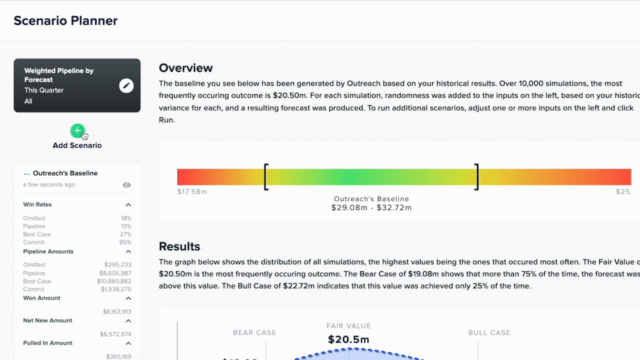Outreach Commit’s flexible mapping layer connects to your CRM and references its entire history. This provides unique statistical modeling for every team and individual within your organization, offering a weekly roll-up view that highlights changes and pipeline movement. An AI-powered scenario planning tool enables revenue leaders to see the assumptions for the current sales forecast and adjust variables such as win rates or pipeline slippage to see how changes will impact the forecast. Finally, deeply integrated analytics capabilities enable operations teams to review the pipeline coverage across specific teams and time periods to compare the projections with actual outcomes. With Outreach Commit’s set of forecasting tools, revenue teams can spend less time pulling data and assembling the forecast, and more time performing analysis on how to drive it higher with the assistance of powerful AI modeling and trend analysis.