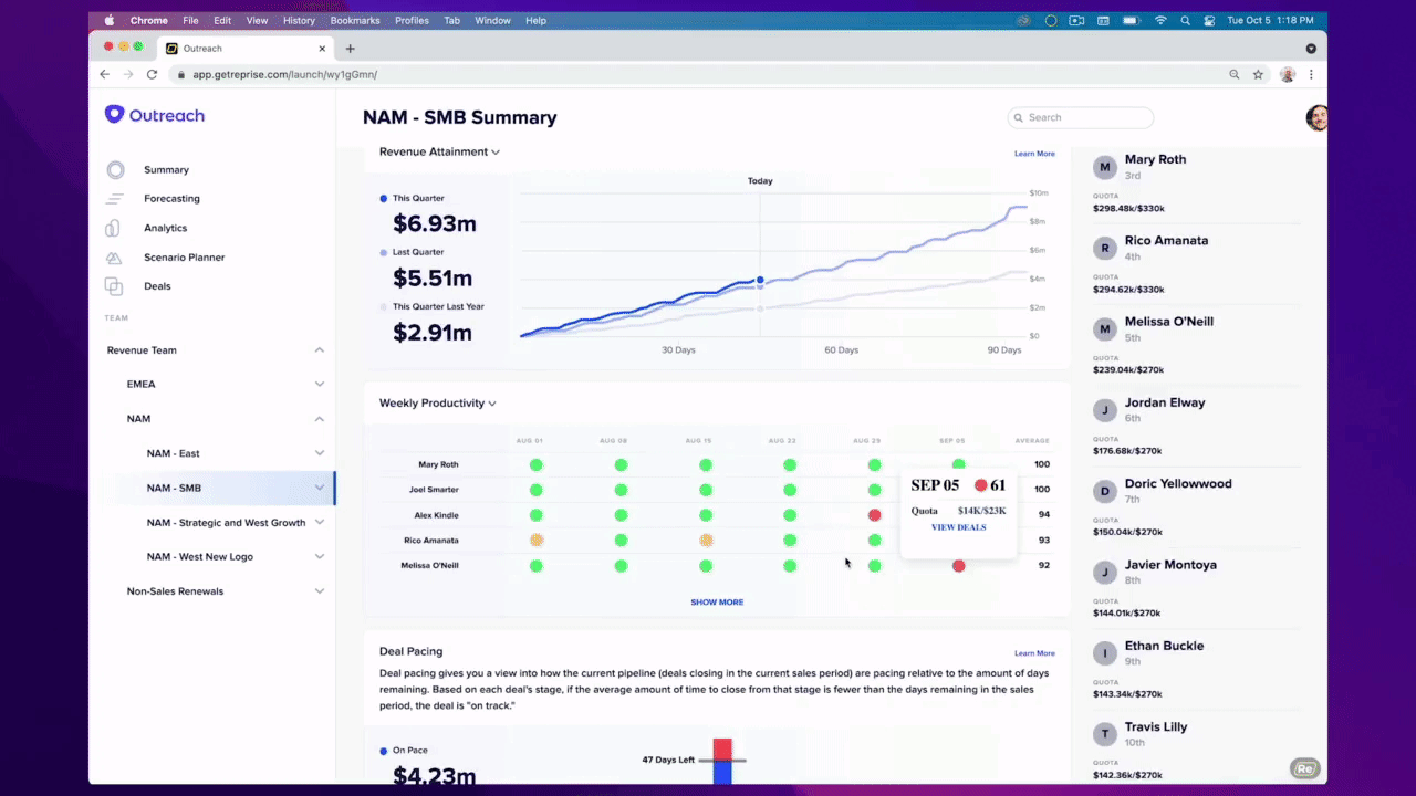 Using historical trend analysis, Outreach Commit helps identify the pipeline coverage needed for each team within the organization to hit its sales goals. This includes accounting for and modeling any fast moving business that is likely to both open and close within the forecast period, and showing how deals in the pipeline are pacing at both the team and individual level. In addition, Outreach Commit makes it possible to help ensure every rep in the organization is performing against their goals with an interactive scorecard that can account for multiple goals with custom weighting.
