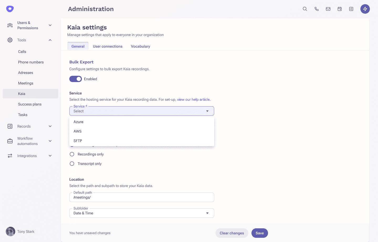 Outreach is already an active member of GTM teams, but teams working outside of Outreach might need information about the latest customer meetings or prospect calls. To support those teams, Rev Ops teams can gain access to KaiaTM recordings with daily exports to customer-owned storage, including AWS S3, Azure Blob Storage, or sFTP Server.
