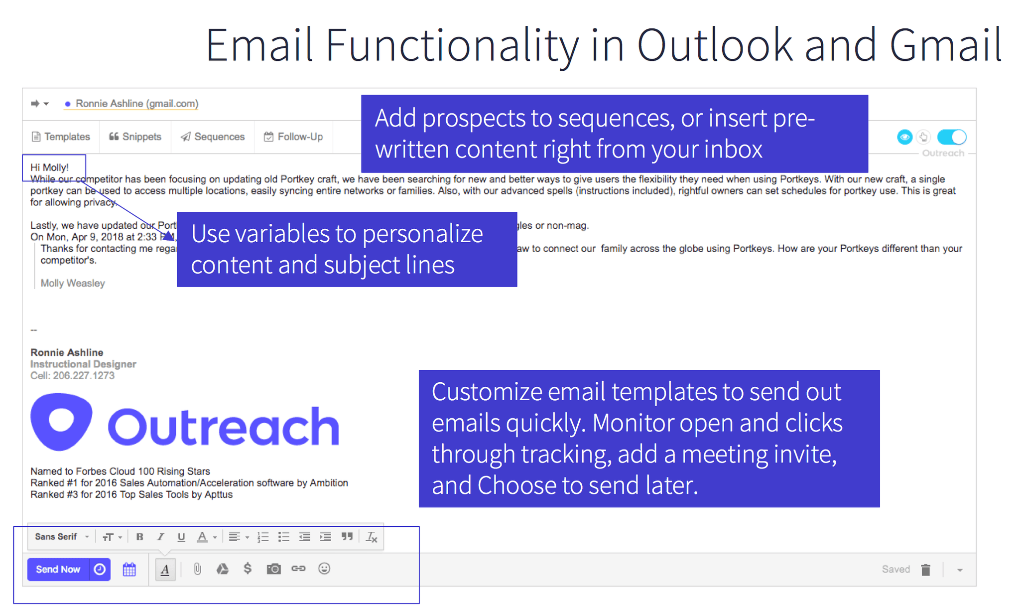 That’s why Outreach lives where you are: Directly in your inbox, whether it’s Gmail or Outlook. No need to toggle from program to program, screen to screen. From right inside your email inbox, you can: