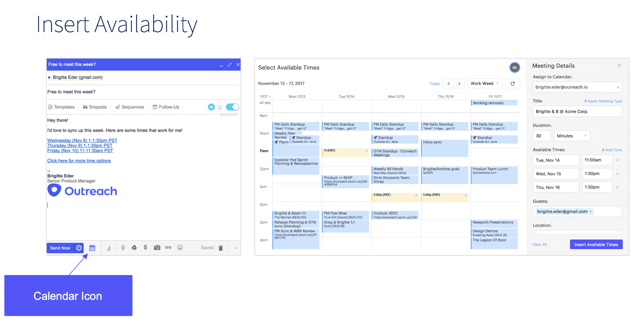 Plus, take advantage of one of Outreach’s newest products — Meetings — to eliminate the tedious back-and-forth required to find a meeting time.
