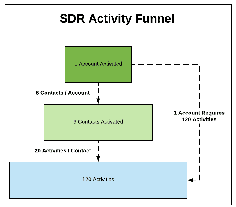 Knowing that each account activation requires 120 activities makes resource planning possible. Now that you know what an activation costs in terms of bandwidth, you can reconcile your two funnels (accounts and activities).