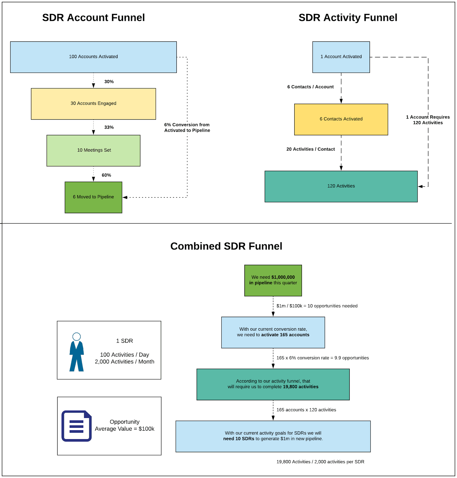 Here’s a visual that will help you explain how to reconcile the two funnels. In this example, your VP of Sales asked you, “How many SDRs do we need to have in order to generate $1m in outbound pipe next quarter?”: