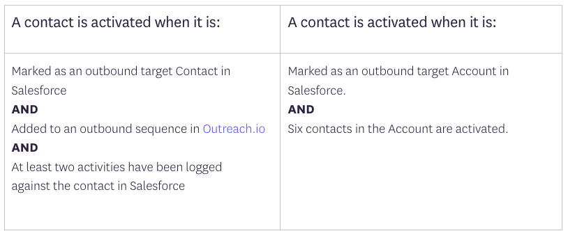 The definitions of activation for contacts and accounts are clear and simple. This makes them easy to understand and track within Salesforce.