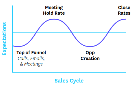Most sales processes today look like a funnel, with the majority of activities being at the top and some activities at the bottom. If a sales team is underperforming, many sales leaders have their sales team do more top-of-the-funnel activities such as calls, emails, and scheduling more meetings. While its true that top-of-the-funnel efficacy can improve bottom-of-funnel outcomes, beyond a certain volume, sales activities will generally reach a point of diminishing returns if there is too much emphasis on lead quantity over quality. So, its crucial for sales leaders to consider other areas, too.