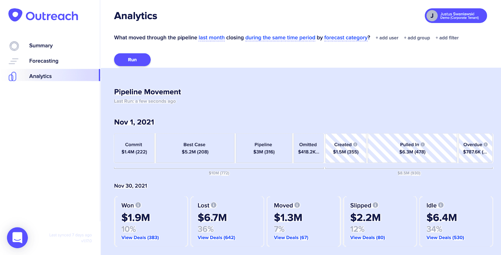 Let’s say you want to know what happened at the end of November to what was in your pipeline at the beginning of the month. Outreach Commit’s analytics function will show you a breakdown of what was in each sales stage or forecast category, and allows you to click into each to see what happened. For example, clicking on ‘best case’ will show you how much of that amount was won, lost, or slipped.