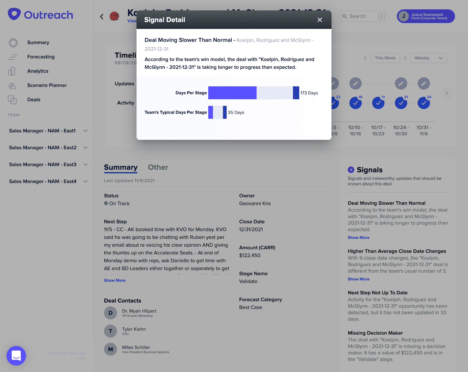 Risk signals in Outreach Commit help identify situations where you or your team may need to work with individual reps to intervene. For example, maybe one of the deals in your pipeline is missing a key decision maker and is moving slower than normal for a typical deal in the same stage. Outreach Commit will highlight this in a single view so that you can understand what needs to be done to resolve the deal risk.