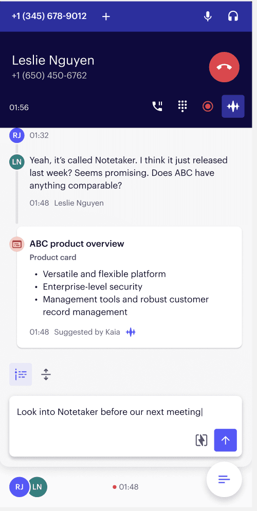 Kaia steps in as an AI-enabled assistant, transcribing the entire call while capturing key meeting moments, action items, and behaviors during the meeting to help win every moment, in the moment — allowing sellers to deliver a better customer experience.