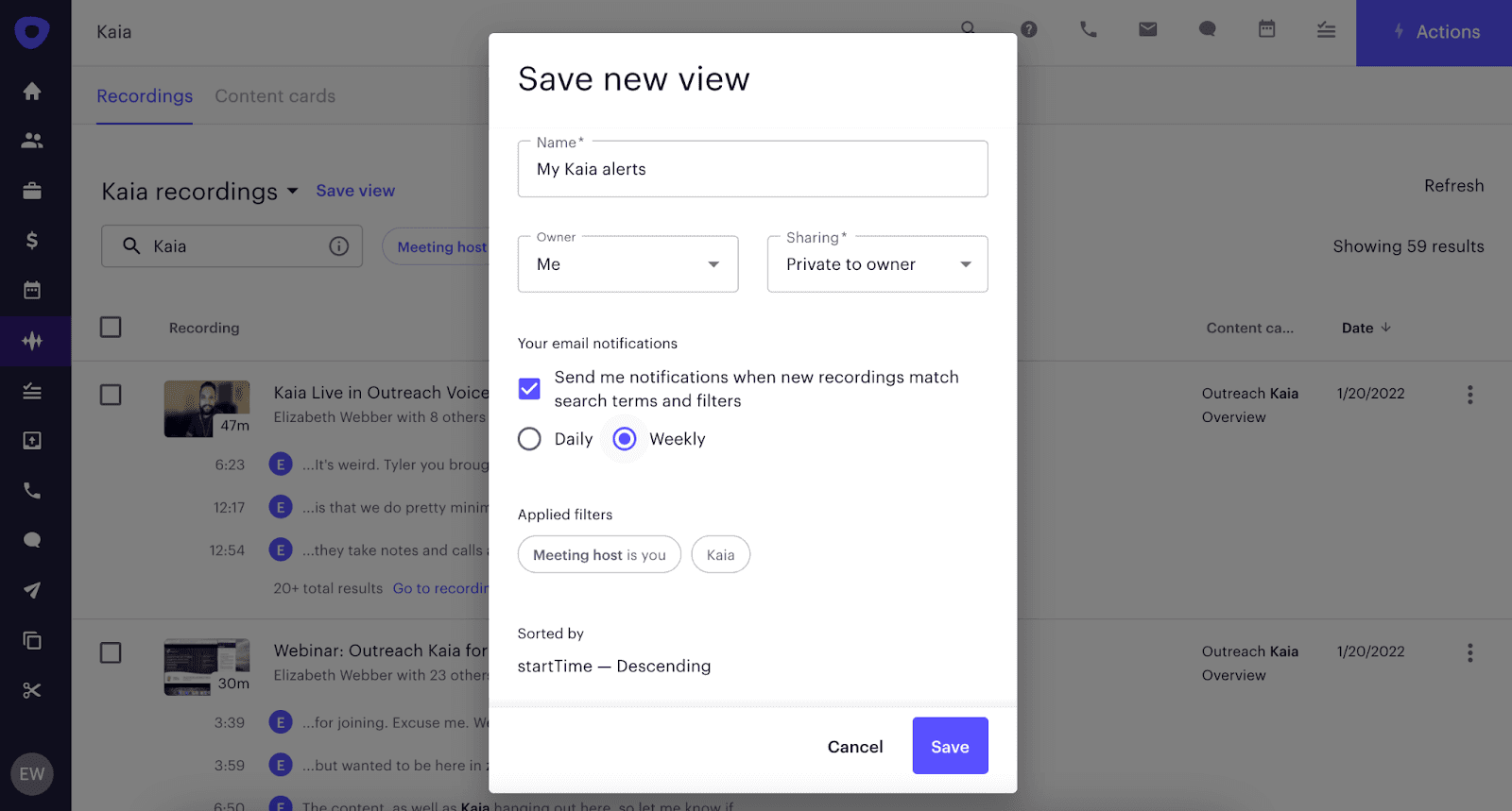 With quick access to action items, call snippets, and searchability across all calls and meetings, you can mitigate earlier risk — keeping calls on track. Outreach also puts AI to work for you by delivering trends, saved searches, and daily notification updates directly to your inbox saving massive amounts of time searching transcript by transcript to make sure sellers are delivering the right message, qualifying and moving opportunities forward. Call recordings and saved searches also provide the perfect opportunity to share winning calls across the team.
