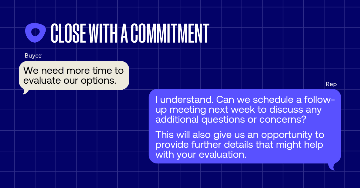 Closing with a commitment means asking for a specific next step, such as scheduling a follow-up meeting or securing a trial period. This shows that you are eager to move forward and continue the conversation. By clearly defining the next steps and gaining a small commitment, you keep the momentum going and demonstrate your dedication to helping the prospect. This clear and decisive action helps to solidify the progress made and sets the stage for a successful partnership.
