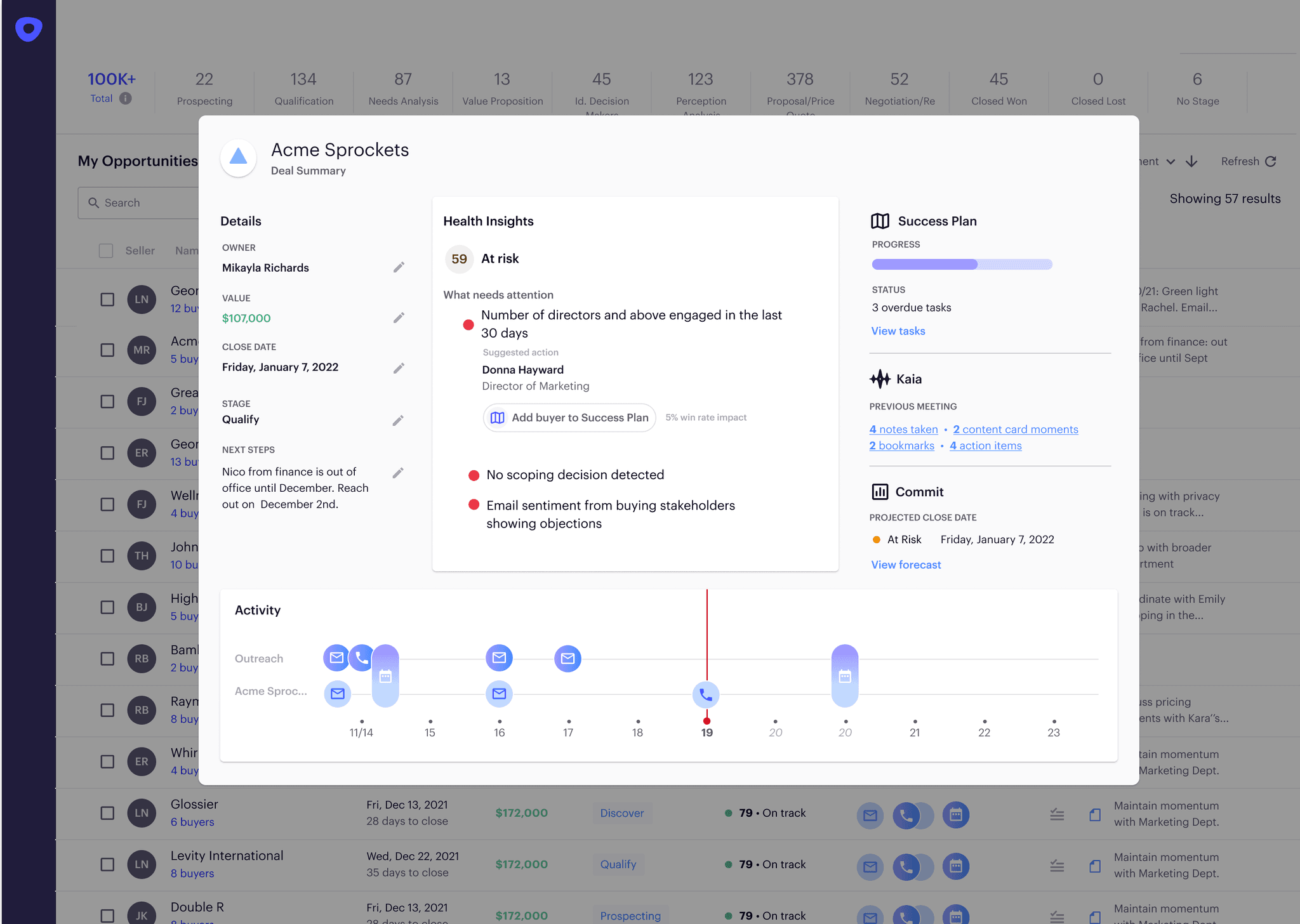 Outreach is the only solution that captures all sales data, activities, and interactions from prospecting to revenue, providing complete revenue observability. CRM and conversation intelligence solutions cannot turn deal risk into impactful actions. Only customers of Outreach’s Engagement and Intelligence Platform can experience the benefits of deal intelligence linked directly to sales engagement, while also benefiting from Outreach Kaia for real-time meeting intelligence and Outreach Commit for revenue intelligence. To learn more about Outreach and how to get started, request a demo.