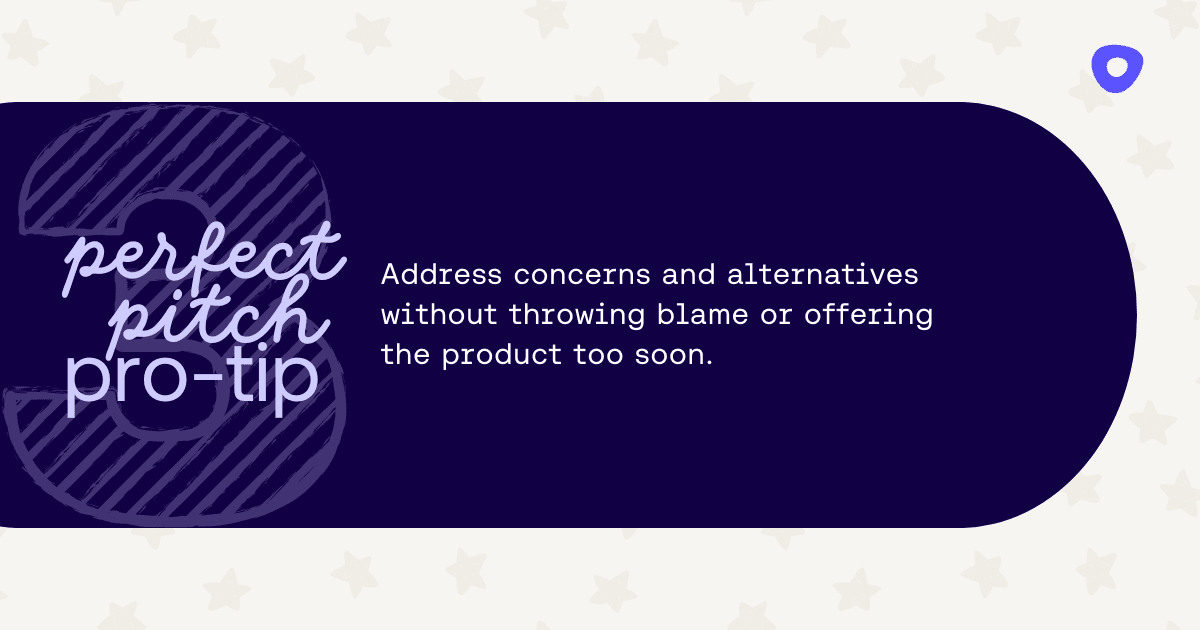 Address concerns and alternatives without throwing blame or offering the product too soon.