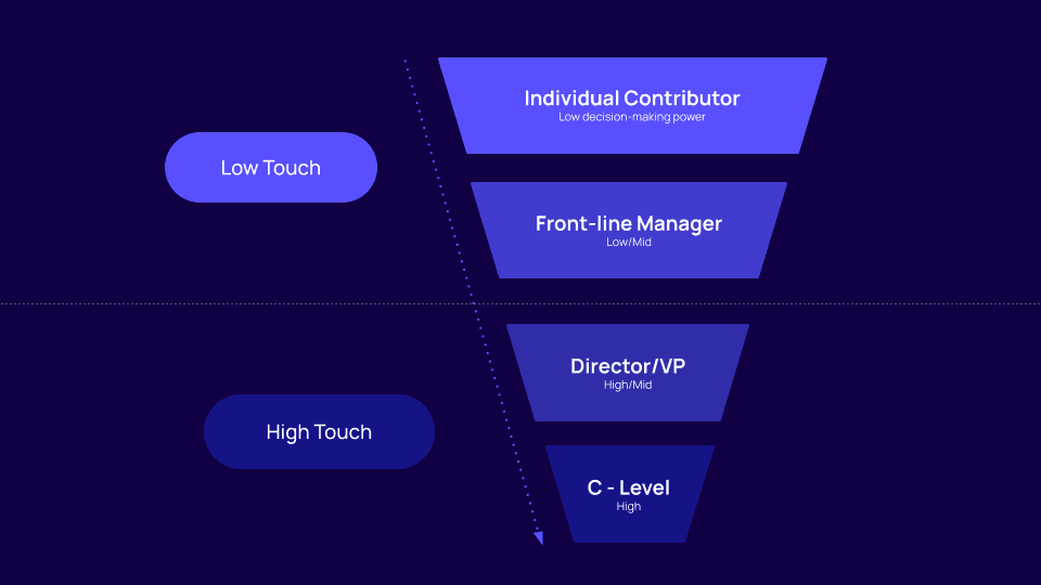 When implementing an ABS and persona-based strategies, you need to differentiate between high-touch and low-touch tactics to tailor interactions to different segments. For example, high-value prospects (say, the head of marketing at your target account) warrant a high-touch approach, with a greater volume of in-depth, personalized engagement. Whereas lower-value prospects (say, a digital marketing lead), while still relevant, aren’t as high a priority.