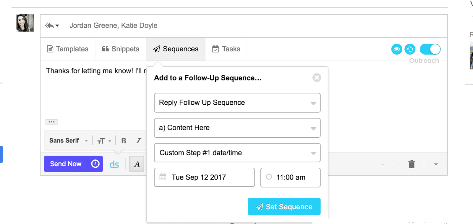 Even better, when you combine our Chrome Extension, Outreach Everywhere, with Gmail, you can add your prospect to the sequence AND schedule the email for delivery at the date and time that’s most relevant to your contact’s request.