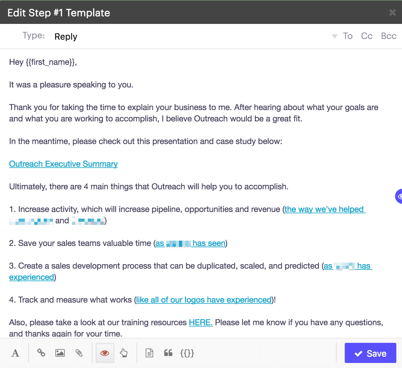 This strategic sequence helps Hank close the deal because, while the first two follow-up sequences are a little more automated, he created this critical set of emails to allow for hyper-personalization. Within Outreach sequences, Hank has the option to make his follow ups as automated or customized as he wants, depending on the situation and where he is in the sales cycle. Additionally, the ability to prioritize a sequence step ensures these late stage deals are top of mind and pushed through the pipe faster. Combining personalization with the automation of a sequence makes sure you never miss a touch point. This is a winning combo that helps Hank and the rest of our AEs crush their quotas.