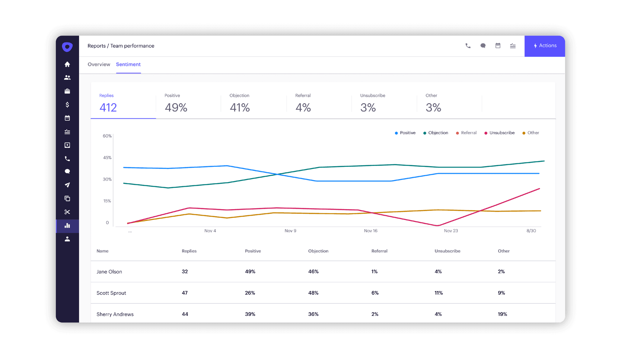 This dashboard provides sales managers with the data and metrics they need (like number of leads, wins, and new accounts) to make decisions, set goals, and track performance. Through analysis of historical and real-time data, sales managers are able to make informed decisions and ensure their team is on track to meet their goals. They gain actionable insights in a single glance to easily identify performance gaps, which they can address through proper training and coaching. A good sales manager dashboard also gives you visibility into buyer sentiment, so you not only understand the high-level activity metrics (i.e. email open or reply rates), but can also make better coaching and strategy adjustments based on those sentimentswhether replies were positive, negative, or otherwise.