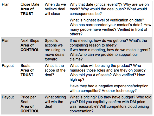 To help my teams incorporate The 4 P’s into their daily lives, I’ve created the below table, which I’m now sharing with you. Sales leaders are strongly encouraged to align the answers to these questions to fields in the CRM.