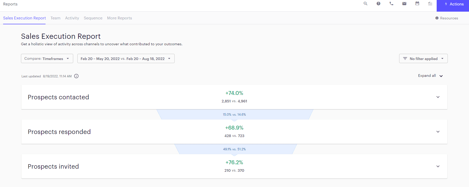 Having the Sales Execution Report unlocks the potential to replicate winning strategies across your teams by comparing what’s going well within your prospecting activities.